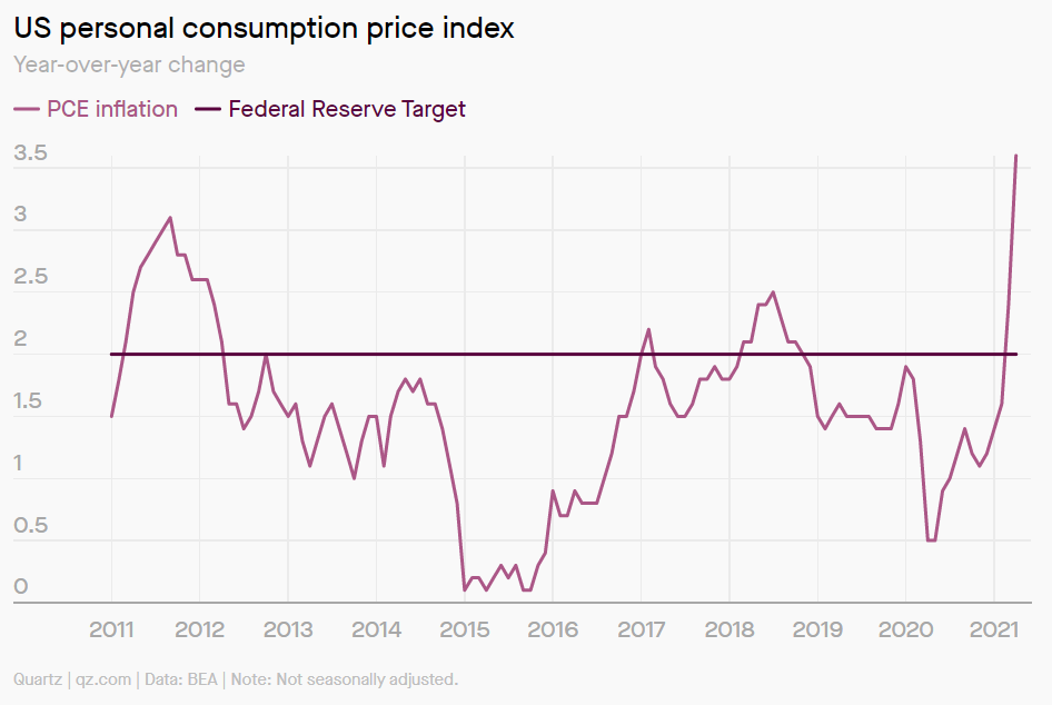 4월의 개인소비지출 물가지수 (PCE)가 +3.6%나 증가