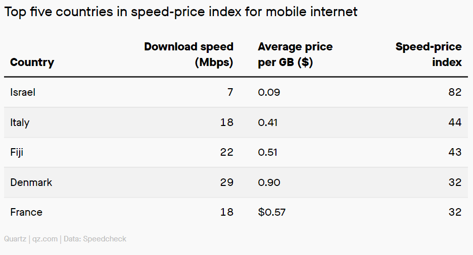 단, 가격요인을 제외하면 투니지아 (Tunisia), 모로코 (Morocco)와 남아프리카 공화국 (South Africa)은 이스라엘보다 빠른 인터넷 스피드를 제공하고 있음