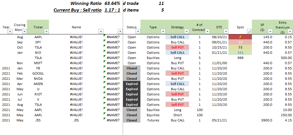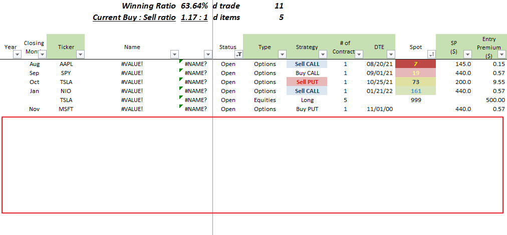 이렇게 하면 보유 중인 실물주식은 리스트의 제일 아래쪽으로, 그리고 만기일이 가장 가까운 옵션이 제일 위에 위치하게 될 뿐 만 아니라 color code로 구분이 쉽도록 했다.